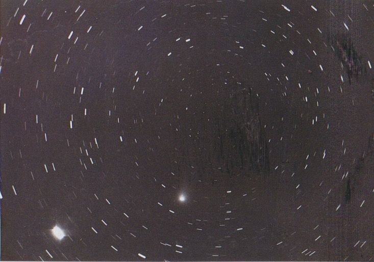 芸西に口径60cmの大型反射望遠鏡が完成して、真っ先に飛び込んできたのはパンサー彗星(1982 Y2)でした。60cm反射望遠鏡を、天の北極点に正しく向けて運転モーターを停めて10分間の静止撮影を行ったところ、たまたまパンサー彗星が北極点にいました。中央の微恒星のほとんど動いていないところが北極点で、北極星は画面の左下の部分に明るく写っています。北極星は真の北極から30分角離れて回っているのです。彗星は北極星の少し右に、やや尾を上に向かって曳いて写っています。