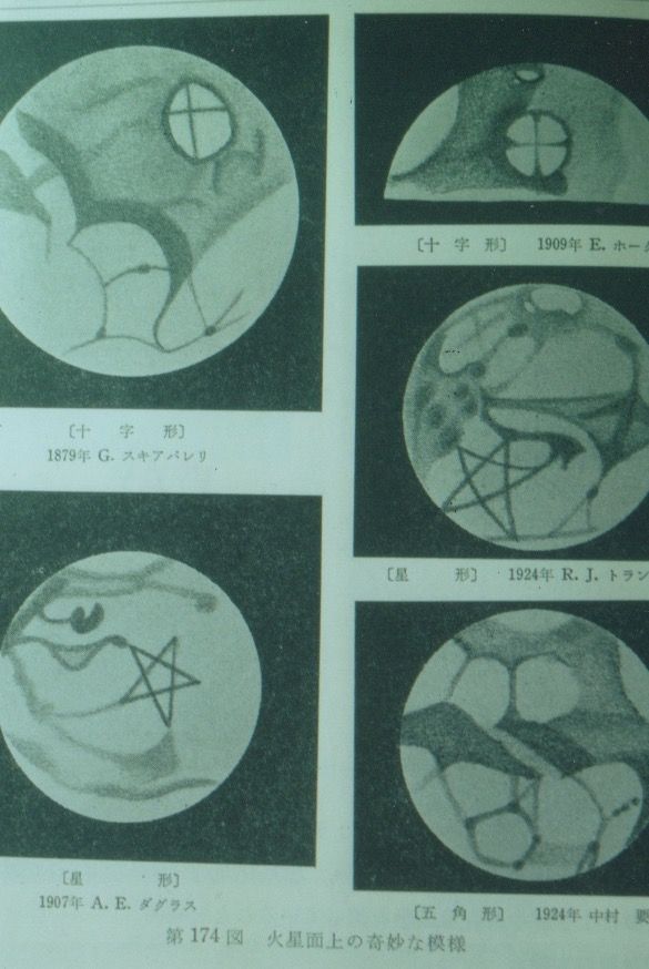 1960年代にアメリカのマリーナ計画による探査機が飛んでいくまでは、火星には高等な動物が住んでいる、と信じられていました。そして、その観念の元に内外の多くの観測者が、火星を観測して、奇妙な模様を描いたのです。多くは戦前ですが、まるで人が描いたような、自然に出来たとは思われない綺麗な幾何学的な模様や「運河」が描かれています。丸に十の字や、星型の整然たる模様。それにオアシスからオアシスへと繋ぐ運河の数々。これはすべては、観測者の錯誤だったのでしょうか?