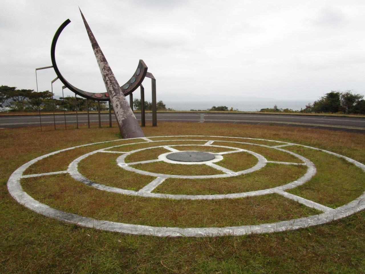海を見下ろす小山の山頂に、大きい奇妙な建造物があります。なんだか巨大な日時計(正午計?)のように見えます。同じ海岸でも、高知市の種崎海岸に本格的な日時計がありましたが、これはどうも太陽の影の位置によって正午を知る道具のようです。それにしても巨大です。誰が、何の意図でこのようなものを建造したのか、何かのシンボル?それとも宇宙人の基地??