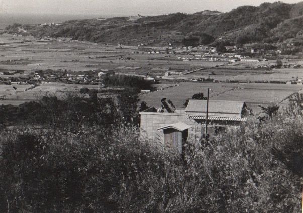 1972年、高知市の上町から、芸西村に移転した当初の観測所です。はるか向こうに、手結山と太平洋が見えています。移転当初は空は暗く観測には絶好の場所でした。謎の光芒”対日照”も、毎晩の如く見えていました。スライドルーフの施設の中に見えている望遠鏡はオール自作の40cm反射望遠鏡です。ここで、五藤式の60cm反射望遠鏡が完成するまで、4個の周期彗星を発見(検出)しました。彗星の捜索のためには12cmの双眼望遠鏡が座っていました。