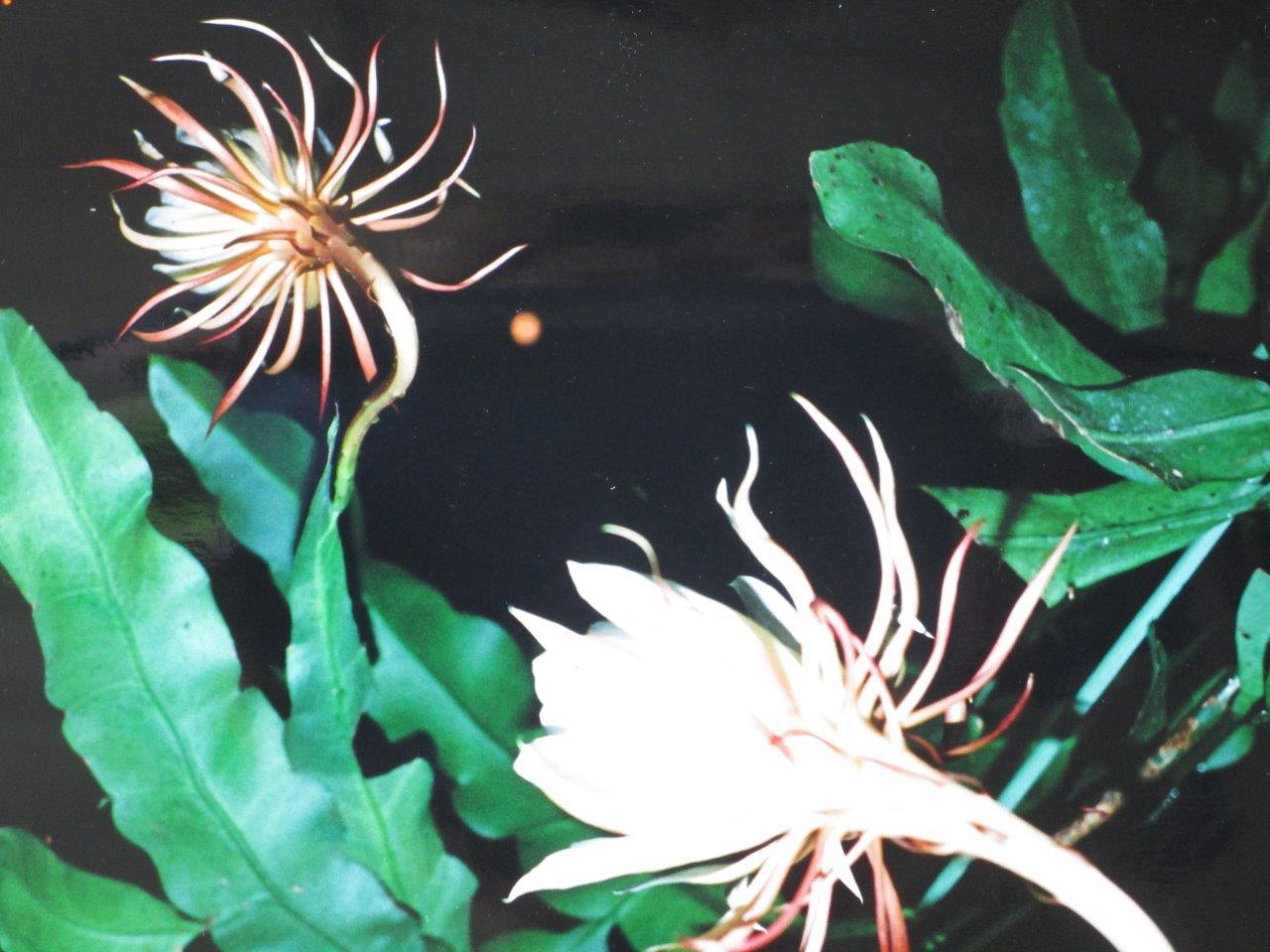 滅多に咲かないと言われている花「月下美人」が、ハレー彗星の去った8月の夜にひそかに咲きました。庭の片隅からいつも夜空に美しい姿で舞うハレー彗星を見ていたのでしょう。「今度は私の番だ」と言わんばかりに、満月の下に咲きました。尾を引いた彗星は”暁の女王”と呼ばれていますが、月下美人は花の中の女王でしょうか。しかし、わずか数時間でしおれていきました。