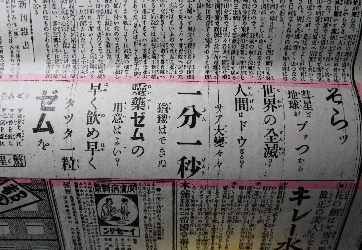 ある日薬局に行っていたら「ゼム」という名の、何かの薬が置いてあるのに気づきました。「ゼム」??どこかで聞いたことのある薬だと思って、考えていたら浮かびました!それは1910年のハレー彗星の大接近の時、売り出された鎮静剤であったことが分かりました。「ハレー彗星との衝突の不安から解消される薬」として明治43年5月20日の東京朝日新聞に広告が出ていました。なんと109年昔のはなしです。