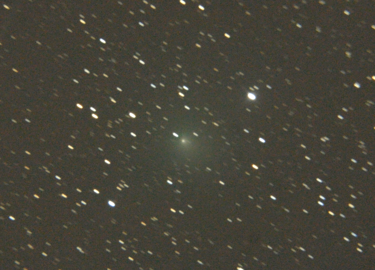 ただ、明るいといっても11~12等星ですから口径15cm以上の天体望遠鏡が必要です。下の写真を見ると、バックの恒星がやや流れていますが、これは望遠鏡が自動的に彗星のモーションを追ったためで、彗星は静止して写っています。短い尾が少し見えているようです。