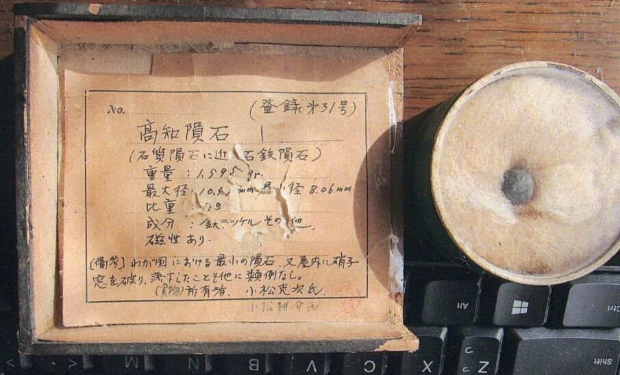 高知隕石は丸い小さな豆のような形で、直径は僅か9mm、世界最小とされている。落下直後、高知大学の沢村教授によって分析され、鉄の中にニッケルも検出され”世界最小の隕石”の折り紙がつけられた。