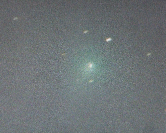 先に紹介した”アトラス彗星”を芸西の70cm反射鏡に同架した15cm屈折望遠鏡で実際に覗いてみました。全光度は9.5でしょうか。グリーンの霧のような光が拡散してPA(方向角)140度に10分角の長さの尾が流れています。まだ彗星までの距離が遠いのですが、このまま太陽に0.2天文単位まで接近するとなると、かなり長い尾をひきそうです。