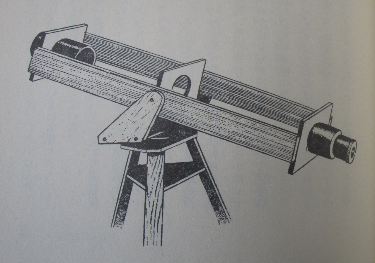 1948年の「日食彗星」の時には私は高校生で、手持ちの単眼鏡を作って彗星に挑戦した。そして1949年になった今、今度は伯父の造りかけた天体望遠鏡を基本に、天体望遠鏡を設計し、製作に乗りだしたのである。当時は、”組み立てキット”の様な、便利なものは一切なく、レンズも売っていない。祖父の使い古しの老眼鏡や、虫眼鏡を利用して、チューブレスの奇妙な天体望遠鏡を自作した。対物レンズはシングルであるから色はつき放題である。口径を3cmくらいに絞って何とかシャープな映像を得た。