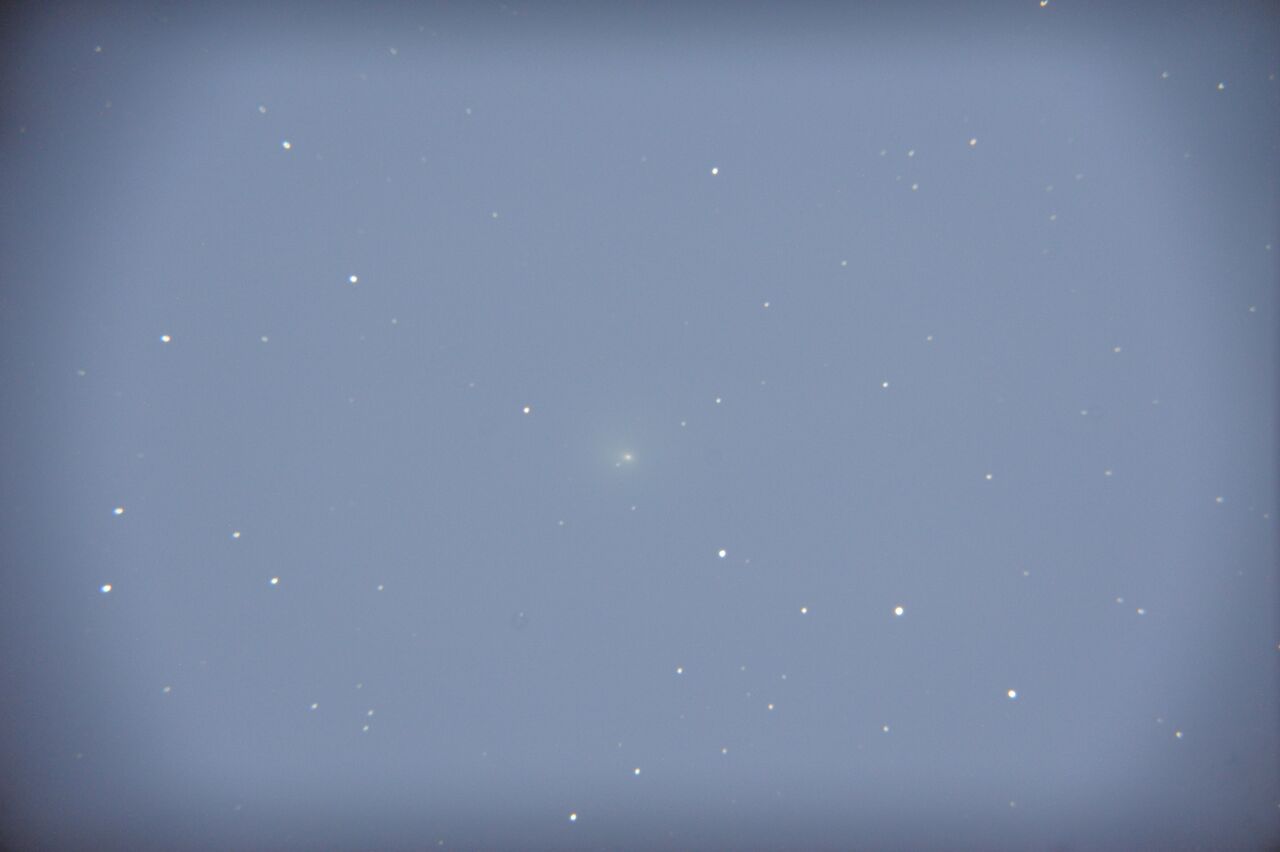 蛍騒動が終わってドームの中から星空を見ました。70cm望遠鏡のレンズの中には、先ほどの蛍の様な青い色をしたパンスターズ彗星が静かに輝いていました。5月4日に近日点を過ぎ、今夕方の天頂付近にあって9等星です。2017年に発見されてから今なお明るく輝いています。息の長い彗星です。