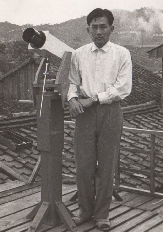 写真は発見した当日コメットシーカーのそばに立った姿。こころは不安で乱れていた。(この空に世界中でまだ誰も知らない天体が輝いているのだ)、と思うと私は異様な雰囲気と期待に包まれていた。東京天文台から、この日は確認の電報は無かった。茫然としてただ夢のような1日をすごした。
