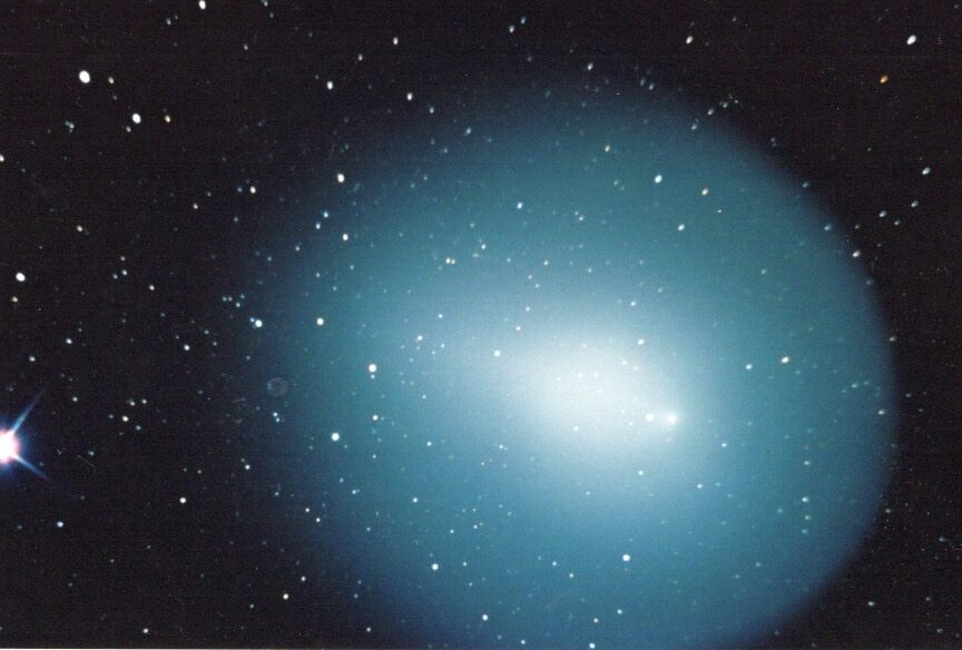 2007年、突然バーストを起こし大増光した時のホームス彗星 17Pである。全体にグリーンの美しいシャボン玉のようなスタイルで、普通の彗星と違って、コマの輪郭が青い風船のように、くっきりとしていたのが特色である。約100年前に出版されたバーナードの天体写真集にも、たまたま爆発した時の、同彗星が捉えられており、アンドロメダ座の大銀河と共に写った同彗星のイメージも全く同じようなクッキリとしたコマを見せていた。