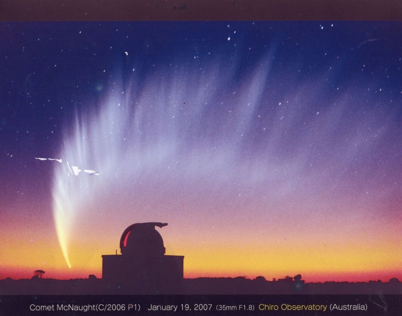 史上最美の彗星と言っても決して過言ではないでしょう。オーストラリアのマクノートが2006年の暮れに発見した彗星です。夕空に見事な景観を呈したところを、天体写真の名人、藤井旭氏が撮影しました。天文台はオーストラリアに立つ、藤井氏の「チロ天文台」です。