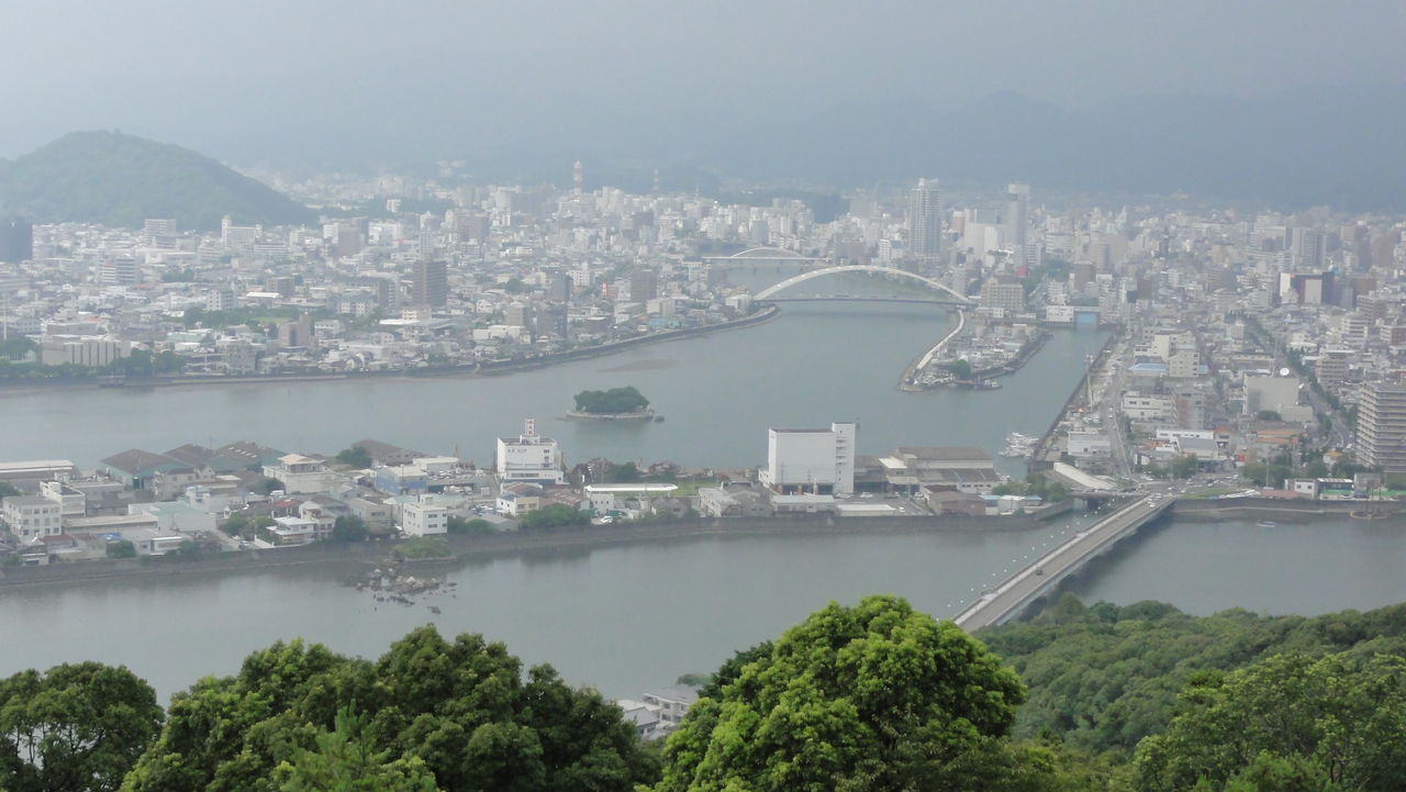 (写真は高知市中央を流れる鏡川の河口付近。小さな島は丸山台)