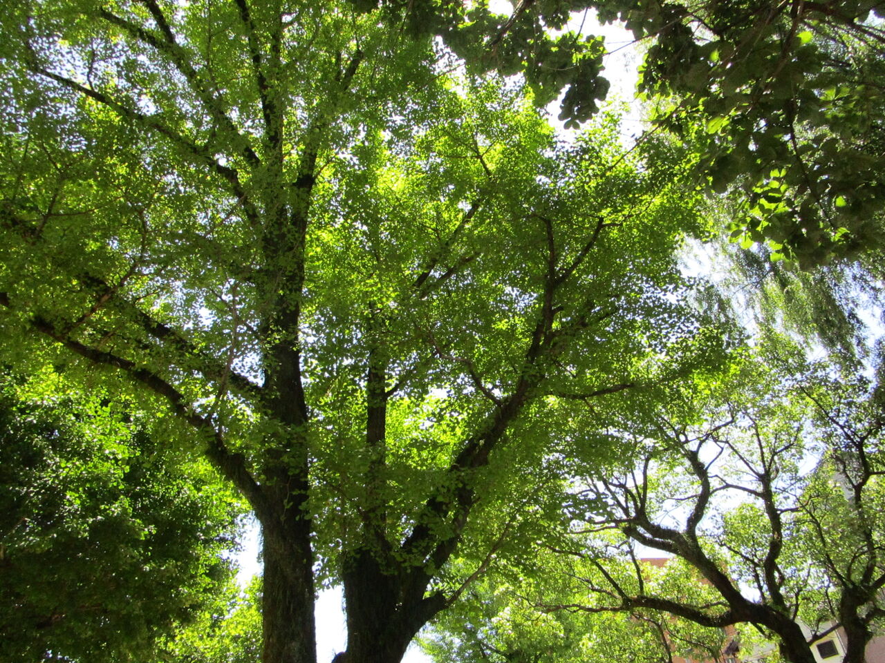 今年の梅雨は短く終わったようです。近くの1kmほどの散歩道を歩いて、児童公園にやってきました。頭上を鬱蒼と覆う新緑が余りにも綺麗なので、白いベンチに腰かけたまま、しばらく眺めていました。