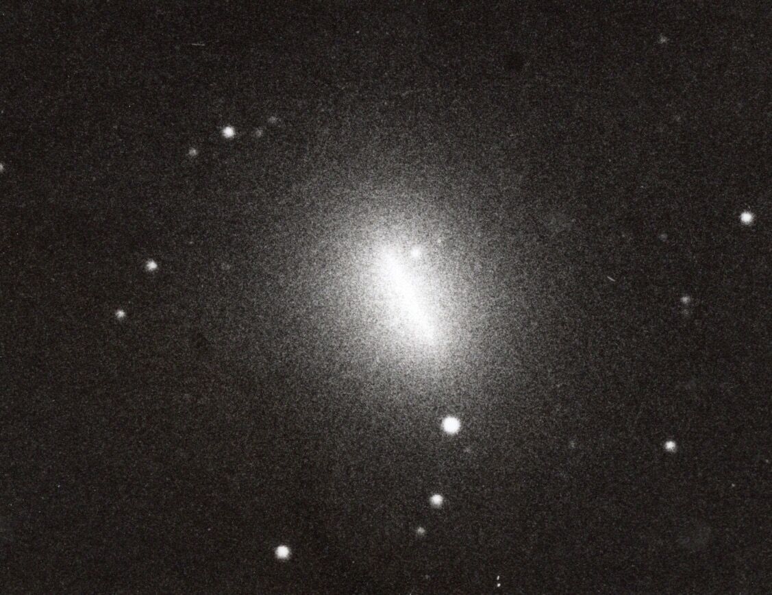 本田さんがカラーで撮影して下さった「関彗星1961 T1」は、発見後次第に地球に接近してきて明るく大きくなった。そして10月の下旬には0.1天文単位と地球に大接近し、満月の大きさとなって一晩に30度以上も動いて南下した。あまりにも急速な運動だったために一旦見失ったが、南天で3等級になり肉眼星になったところを、銚子市の天体写真の名手、瀧田正俊さんが、見事にキャッチしてくれた。視直径が30分角の円盤像で尾は見えなかった。