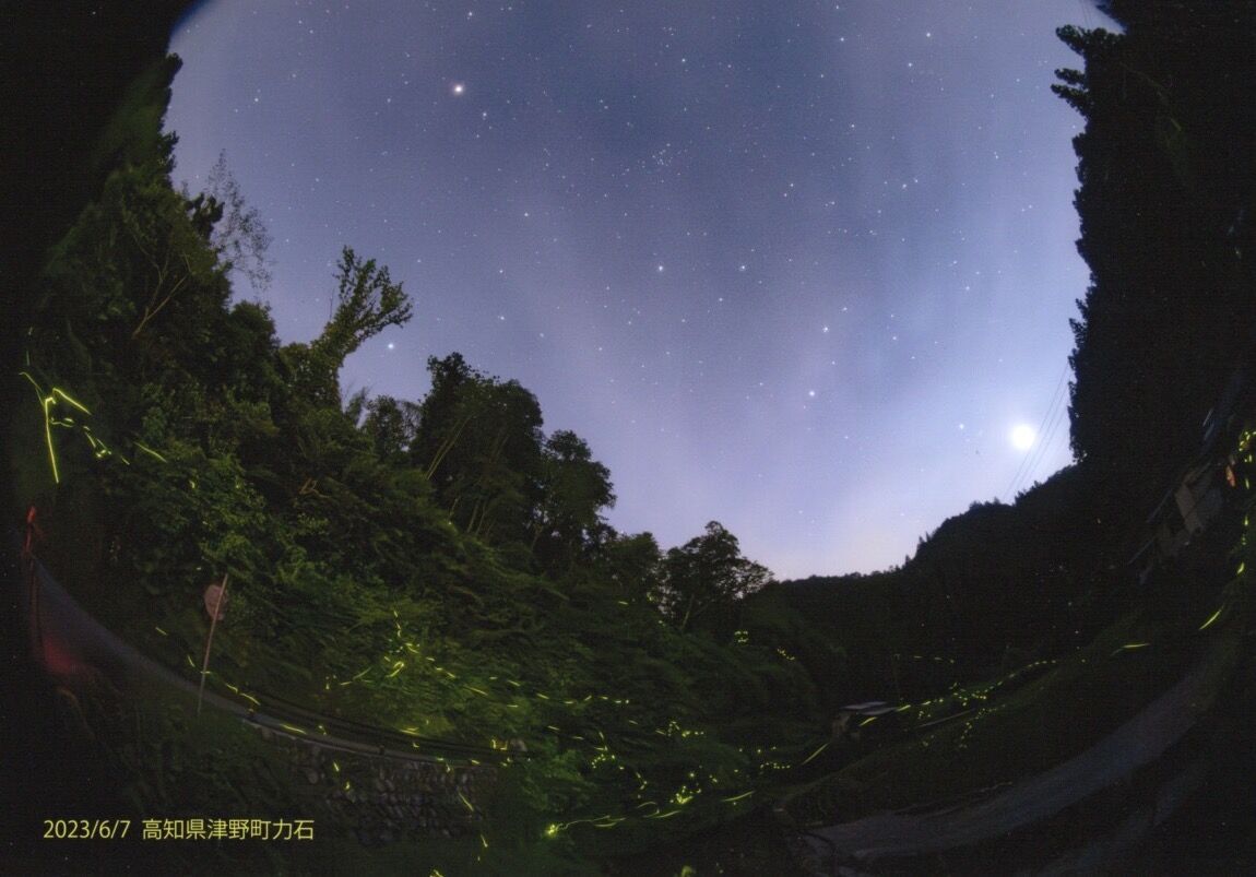 明るい宵の明星の輝く夕空に黄色い線を引いて、一面に輝いて飛んでいるのが蛍です。今は余程の田舎に行かないとこれだけの蛍は見えませんが、昔は芸西村の天文台でもドームの上を飛ぶ姿が見られました。