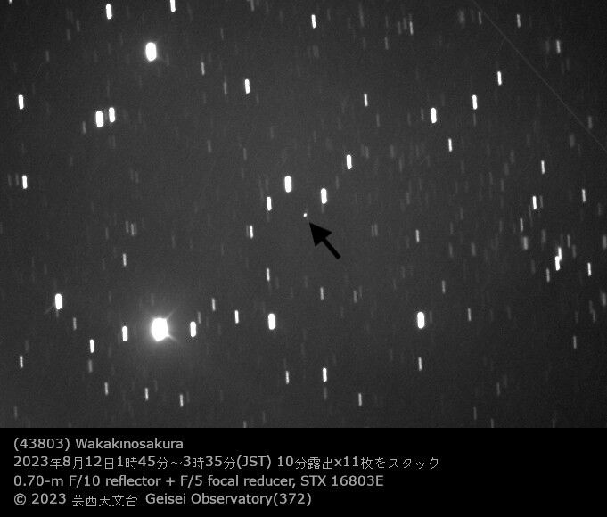 小惑星「ワカキノサクラ」は牧野太郎博士が命名した桜の木で、先にその苗木が宇宙を飛んだことでも有名ですが、先日、芸西村の天文台で、それの観測会がありました。いま地球から見て最も見やすい位置にあり、18等星です。芸西天文台の下元講師が最近撮影に成功しましたので、お目にかけます。口径70センチ反射望遠鏡を使って撮影したものです。