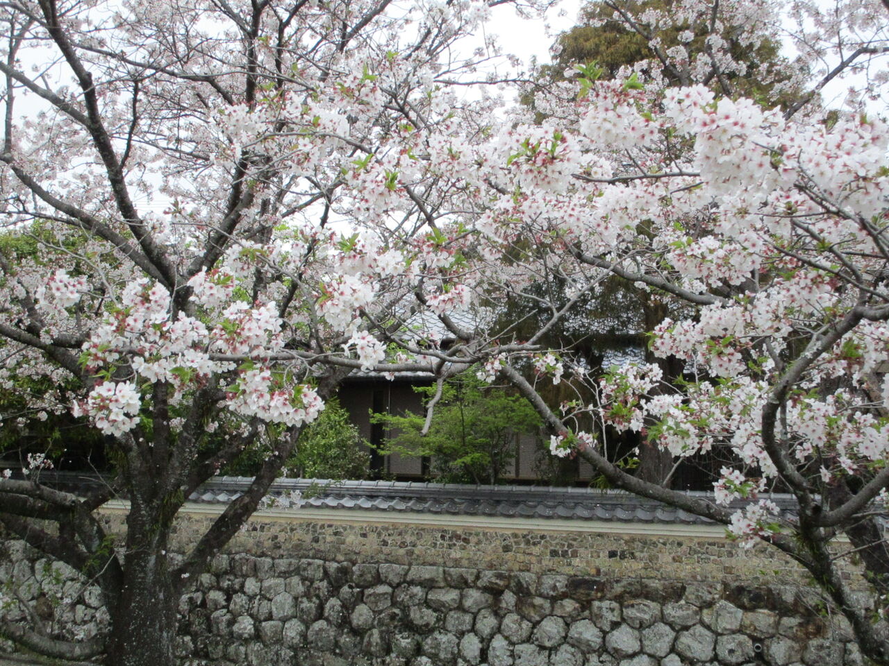 藩政年代から築かれた有名な石垣の塀が続いています。築屋敷町と言います。私の歩いている土手のすぐ南側は、清流「鏡川」が流れています。小学生のころには学校から水泳の授業で泳ぎに来ました。そして、昭和20年7月4日の高知市大空襲では、この川に逃れました。焼夷弾の油脂があふれて、川も火の海となりました。そのような、忌まわしい記憶がよみがえってきましたが、今は平和な時代です。ちょうど満開の桜が見事です。300米ほどの桜並木です。