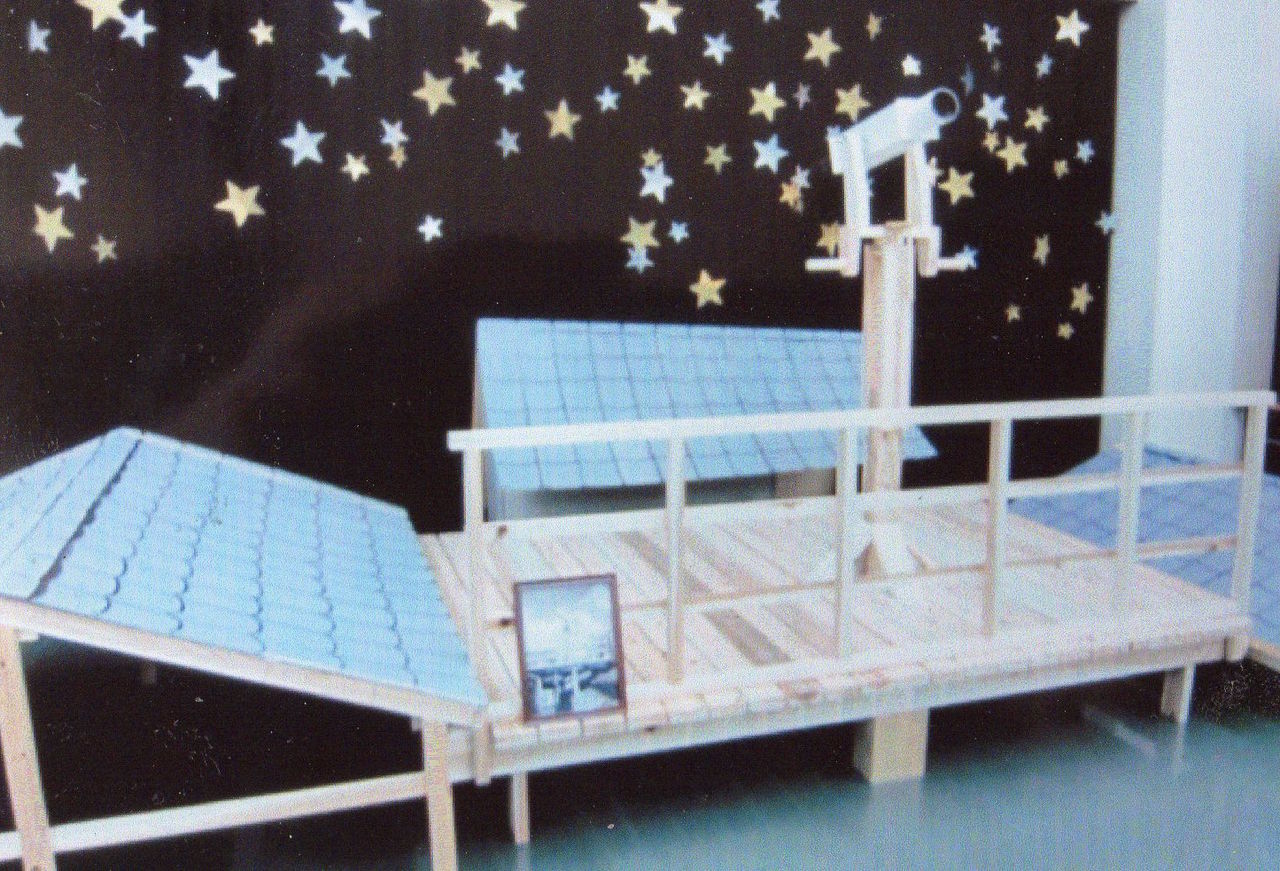 1961年当時の「物干し観測台」を再現してみました。数年前の、高知市科学図書館での天文講演会は、この上に立って話しました。そう、野良猫のやってきていた観測台です。1965年の”池谷・関彗星”接近の時には、沢山の報道関係者が、左側の母屋の屋根に上がって、突如崩れました。