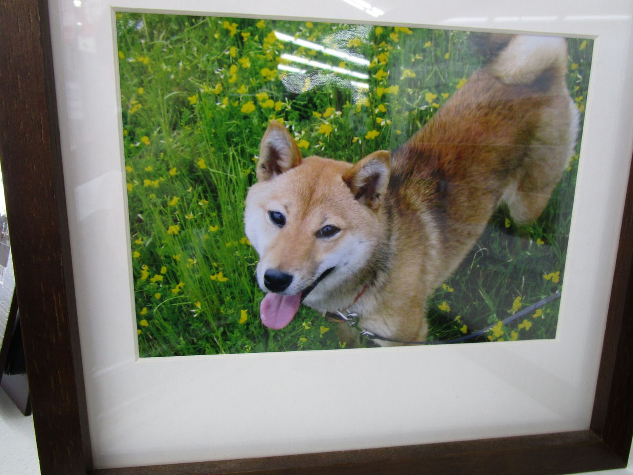 不思議な事件が起こりました。先日、市内の写真材料店を訪ねると、ショーウインドウに置いてある額の見本に、柴犬の写真が使われていました。良く見ると、それは紛れもなく飼い犬の「タロ」でした。失踪してから10年余、私の祈りが通じたのか、額で姿を見せてくれたのです。撮影された場所は、家に近い鏡川の原っぱの様です。