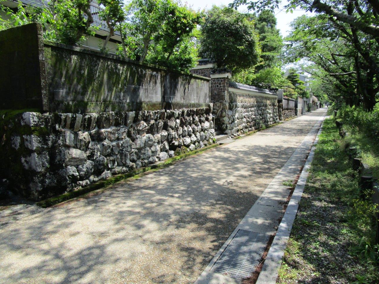私の好きな散歩道です。石垣の塀が並んでいることから「築屋敷」と言います。鏡川のほとりにある静かな住宅街です。昔、坂本龍馬が剣術に通っていた道場がこの辺にあったそうで、誰も通らない道を歩いていると、向こうから龍馬が竹刀を持って歩いてきそうな気がします。石垣は安政時代からの歴史があります。