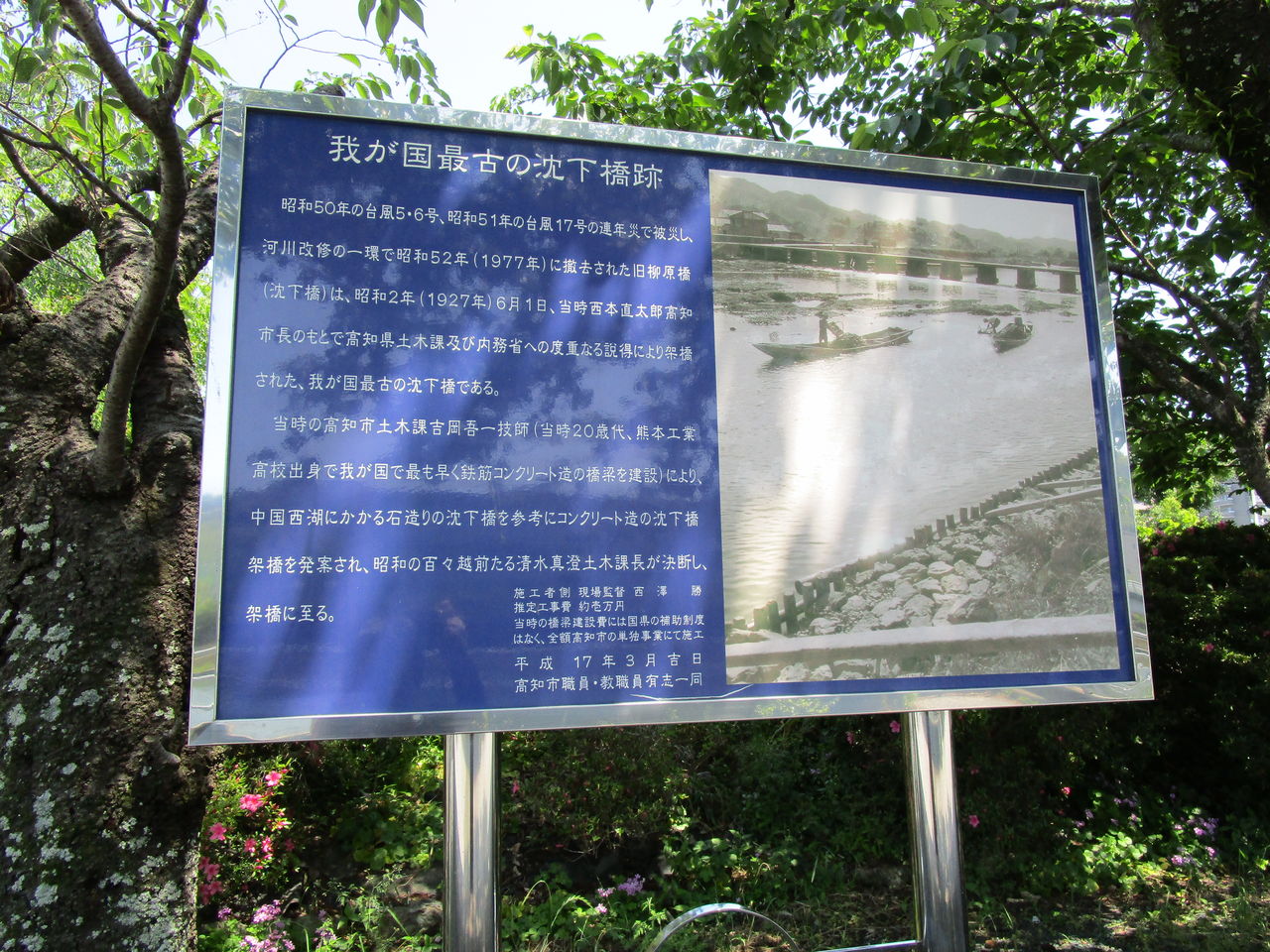 静かな築屋敷町を抜けると急に広い河原にでた。川に面して忠霊塔と「フランクチャンピオン」の碑が立っている。良く見ると新しい観光の看板が立っていた。昔、この付近の川にかかっていた沈下橋の説明で、なんでも日本で一番最初に出来た沈下橋であったという。私たちが子供のころに良くこのコンクリートの低い橋を渡って、鏡川の南側のいろんな施設にでかけたものである。