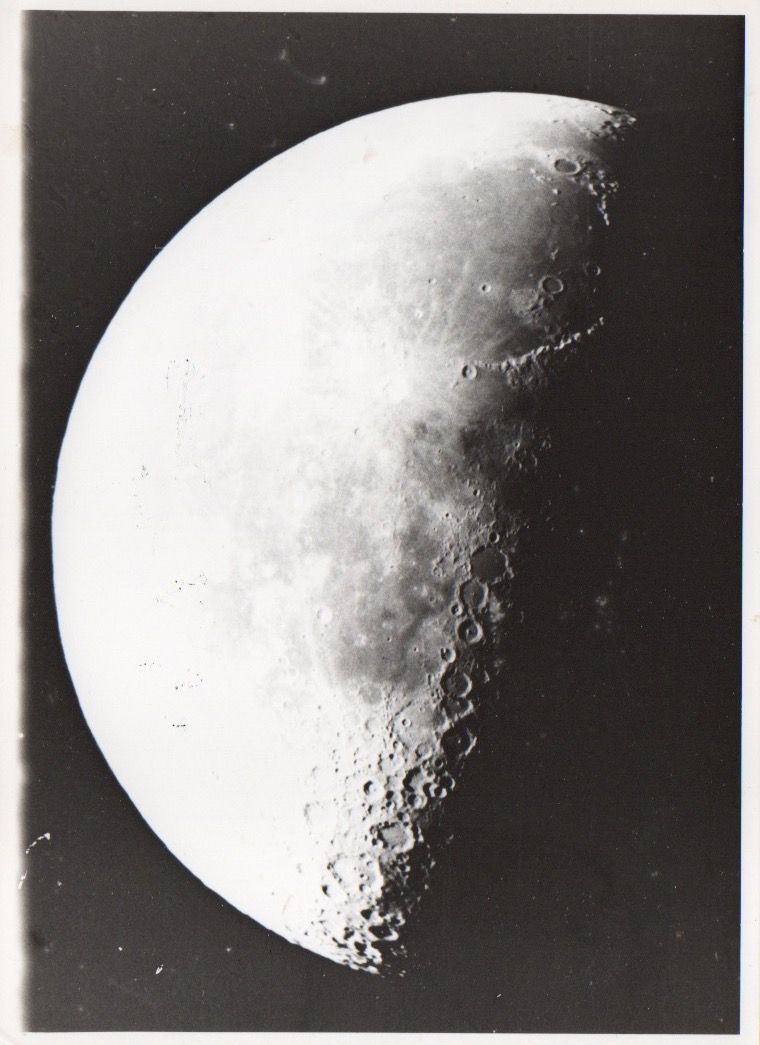 写真は芸西の60cm反射望遠鏡で見た半月です。昼と夜の境目あたりにクレーターが目立っています。上が北です。